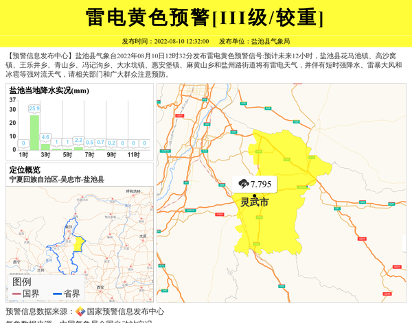 【预警信息发布中心】盐池县气象台2022年08月10日12时32分发布雷电黄色预警信号:预计未来12小时,盐池县花马池镇、高沙窝镇、王乐井乡、青山乡、冯记沟乡、大水坑镇、惠安堡镇、麻黄山乡和盐州路街道将有雷电天气,并伴有短时强降水、雷暴大风和冰雹等强对流天气,请相关部门和广大群众注意预防。 信息来源:国家预警信息发布中心; 发布单位:盐池县气象局。