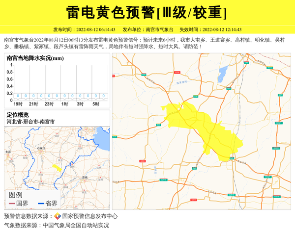 南宫市气象台2022年08月12日06时13分发布雷电黄色预警信号:预计未来6小时,我市大屯乡、王道寨乡、高村镇、明化镇、吴村乡、垂杨镇、紫冢镇、段芦头镇有雷阵雨天气,局地伴有短时强降水、短时大风。请防范! 信息来源:国家预警信息发布中心; 发布单位:南宫市气象台。