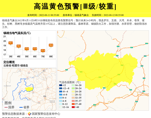 镇雄县气象台2022年8月11日8时55分继续发布高温黄色预警信号:预计未来24小时内,我县罗坎、五德、大湾、木卓、母享、坡头、杉树、黑树等乡镇最高气温将升至35℃以上,请注意防暑降温、森林草原、城镇防火工作,加强河塘、水库管理,做好防溺水工作。 信息来源:国家预警信息发布中心; 发布单位:镇雄县气象台。