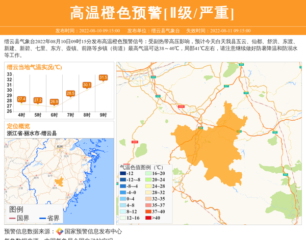 缙云县气象台2022年08月10日09时15分发布高温橙色预警信号:受副热带高压影响,预计今天白天我县五云、仙都、舒洪、东渡、新建、新碧、七里、东方、壶镇、前路等乡镇(街道)最高气温可达38~40℃,局部41℃左右,请注意继续做好防暑降温和防溺水等工作。 信息来源:国家预警信息发布中心; 发布单位:缙云县气象台。