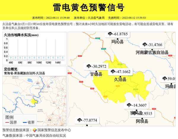 久治县气象台8月11日15时40分发布雷电黄色预警信号:预计未来6小时久治地区可能发生雷电活动,有可能会造成雷电灾害。请有关单位和人员做好防范准备。 信息来源:国家预警信息发布中心; 发布单位:久治县气象局。