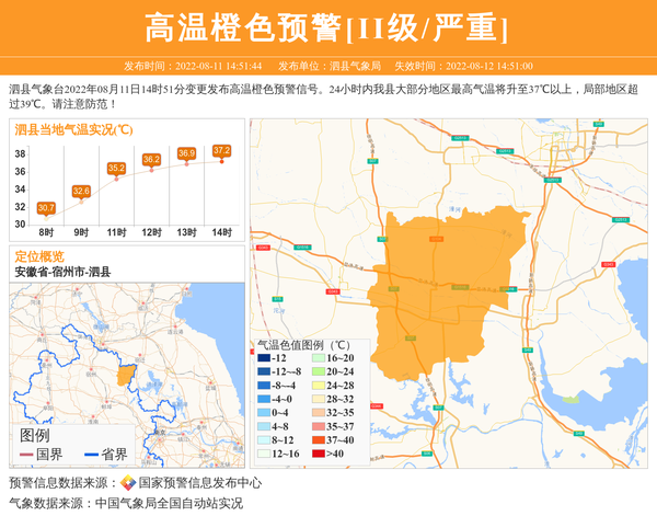 泗县气象台2022年08月11日14时51分变更发布高温橙色预警信号。24小时内我县大部分地区最高气温将升至37℃以上,局部地区超过39℃。请注意防范! 信息来源:国家预警信息发布中心; 发布单位:泗县气象局。