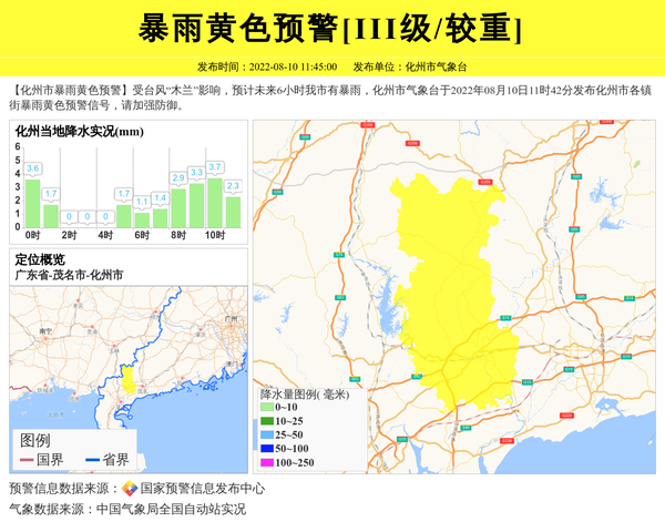 【化州市暴雨黄色预警】受台风“木兰”影响,预计未来6小时我市有暴雨,化州市气象台于2022年08月10日11时42分发布化州市各镇街暴雨黄色预警信号,请加强防御。 信息来源:国家预警信息发布中心; 发布单位:化州市气象台。