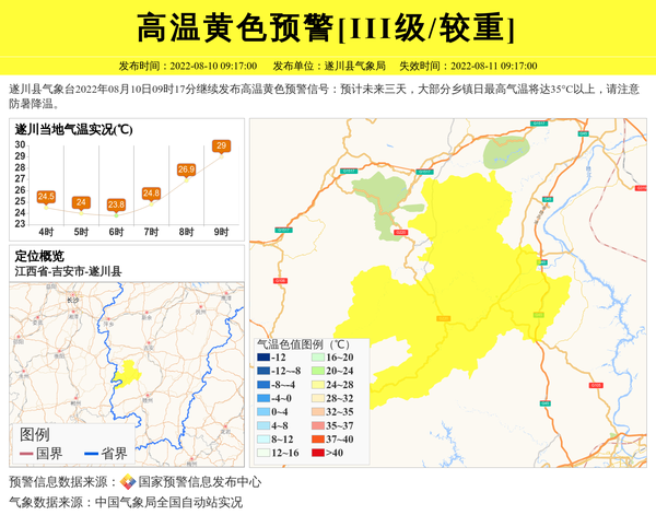 遂川县气象台2022年08月10日09时17分继续发布高温黄色预警信号:预计未来三天,大部分乡镇日最高气温将达35°C以上,请注意防暑降温。 信息来源:国家预警信息发布中心; 发布单位:遂川县气象局。