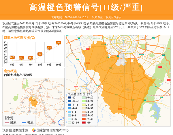 双流区气象台2022年08月10日10时15分对2022年08月07日10时15分发布的高温橙色预警信号进行第3次确认:我台8月7日10时15分发布的高温橙色预警信号继续有效,预计未来24小时我区所有镇(街道)最高气温将升至35℃以上,其中大于35℃的高温时段在12-18时。请注意防范晴热高温天气带来的不利影响。 信息来源:国家预警信息发布中心; 发布单位:双流区气象台。