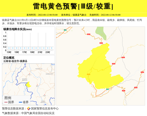 镇康县气象台2022年8月12日0时58分继续发布雷电黄色预警信号:预计未来6小时,我县南伞镇、勐堆乡、勐捧镇、凤尾镇、忙丙乡、木场乡、军赛乡将出现雷电活动,并伴有短时强降水,请注意防范。 信息来源:国家预警信息发布中心; 发布单位:镇康县气象台。