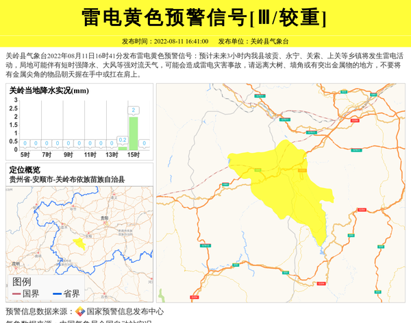关岭县气象台2022年08月11日16时41分发布雷电黄色预警信号:预计未来3小时内我县坡贡、永宁、关索、上关等乡镇将发生雷电活动,局地可能伴有短时强降水、大风等强对流天气,可能会造成雷电灾害事故,请远离大树、墙角或有突出金属物的地方,不要将有金属尖角的物品朝天握在手中或扛在肩上。 信息来源:国家预警信息发布中心; 发布单位:关岭县气象台。