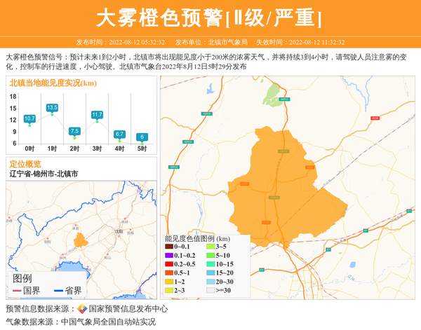 大雾橙色预警信号:预计未来1到2小时,北镇市将出现能见度小于200米的浓雾天气,并将持续3到4小时,请驾驶人员注意雾的变化,控制车的行进速度,小心驾驶。北镇市气象台2022年8月12日5时29分发布 信息来源:国家预警信息发布中心; 发布单位:北镇市气象局。