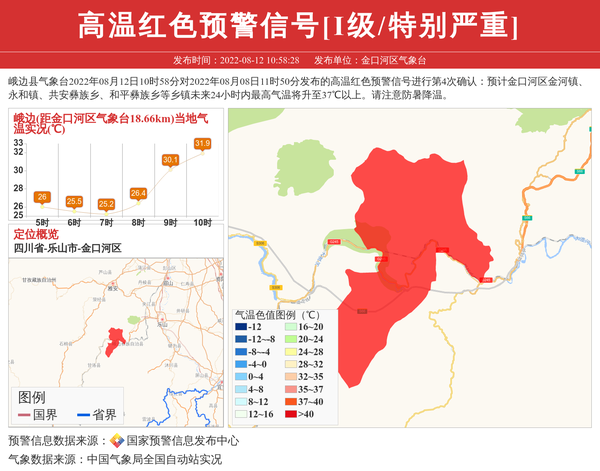 峨边县气象台2022年08月12日10时58分对2022年08月08日11时50分发布的高温红色预警信号进行第4次确认:预计金口河区金河镇、永和镇、共安彝族乡、和平彝族乡等乡镇未来24小时内最高气温将升至37℃以上。请注意防暑降温。 信息来源:国家预警信息发布中心; 发布单位:金口河区气象台。
