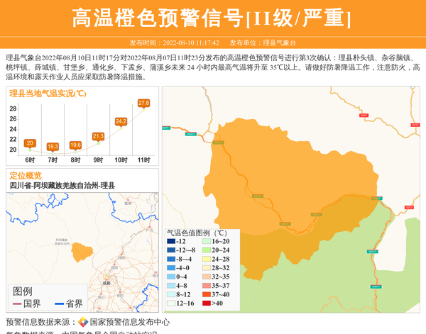 理县气象台2022年08月10日11时17分对2022年08月07日11时23分发布的高温橙色预警信号进行第3次确认:理县朴头镇、杂谷脑镇、桃坪镇、薛城镇、甘堡乡、通化乡、下孟乡、蒲溪乡未来 24 小时内最高气温将升至 35℃以上。请做好防暑降温工作,注意防火,高温环境和露天作业人员应采取防暑降温措施。 信息来源:国家预警信息发布中心; 发布单位:理县气象台。