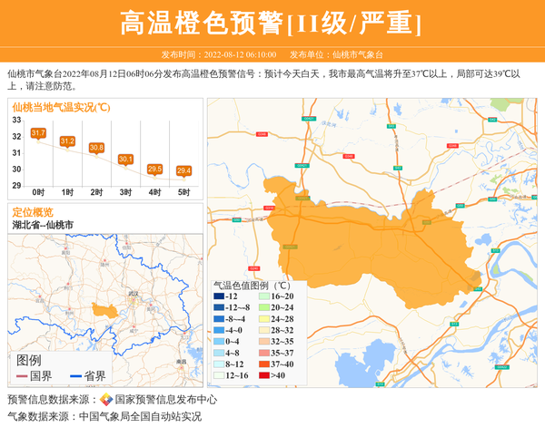 仙桃市气象台2022年08月12日06时06分发布高温橙色预警信号:预计今天白天,我市最高气温将升至37℃以上,局部可达39℃以上,请注意防范。 信息来源:国家预警信息发布中心; 发布单位:仙桃市气象台。