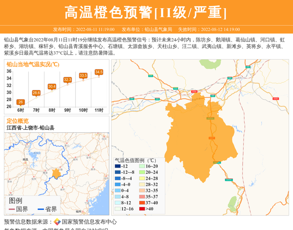 铅山县气象台2022年08月11日11时19分继续发布高温橙色预警信号:预计未来24小时内,陈坊乡、鹅湖镇、葛仙山镇、河口镇、虹桥乡、湖坊镇、稼轩乡、铅山县青溪服务中心、石塘镇、太源畲族乡、天柱山乡、汪二镇、武夷山镇、新滩乡、英将乡、永平镇、紫溪乡日最高气温将达37°C以上,请注意防暑降温。 信息来源:国家预警信息发布中心; 发布单位:铅山县气象局。