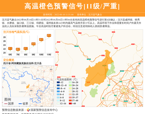 汶川县气象台更新高温橙色预警信号[II级/严重] 相关文章