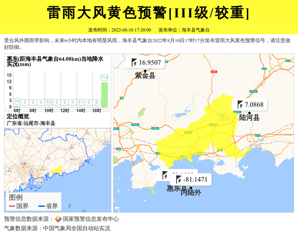 受台风外围雨带影响,未来6小时内本地有明显风雨,海丰县气象台2022年8月10日17时17分发布雷雨大风黄色预警信号,请注意做好防御。 信息来源:国家预警信息发布中心; 发布单位:海丰县气象台。