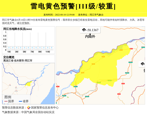 同江市气象台8月10日12时59分发布雷电黄色预警信号:我市部分乡镇已经发生雷电活动,局地可能伴有短时强降水、大风、冰雹等强对流天气,请注意预防。 信息来源:国家预警信息发布中心; 发布单位:同江市气象台。
