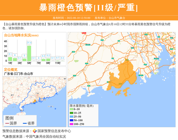 【台山暴雨黄色预警升级为橙色】预计未来6小时我市强降雨持续,台山市气象台8月10日12时55分将暴雨黄色预警信号升级为橙色,请加强防御。 信息来源:国家预警信息发布中心; 发布单位:台山市气象台。