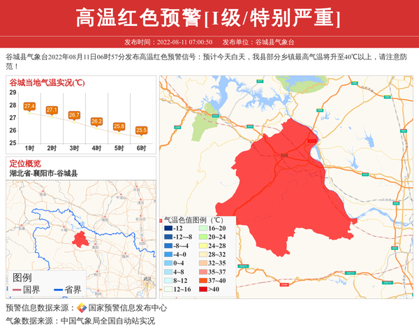 谷城县气象台2022年08月11日06时57分发布高温红色预警信号:预计今天白天,我县部分乡镇最高气温将升至40℃以上,请注意防范! 信息来源:国家预警信息发布中心; 发布单位:谷城县气象台。