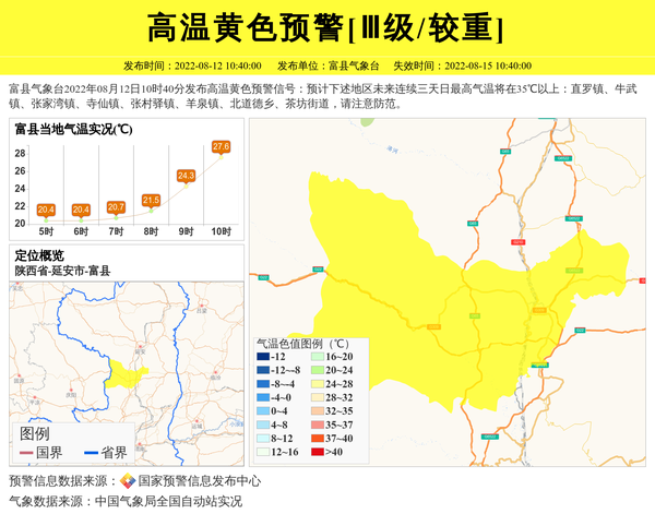 富县气象台2022年08月12日10时40分发布高温黄色预警信号:预计下述地区未来连续三天日最高气温将在35℃以上:直罗镇、牛武镇、张家湾镇、寺仙镇、张村驿镇、羊泉镇、北道德乡、茶坊街道,请注意防范。 信息来源:国家预警信息发布中心; 发布单位:富县气象台。