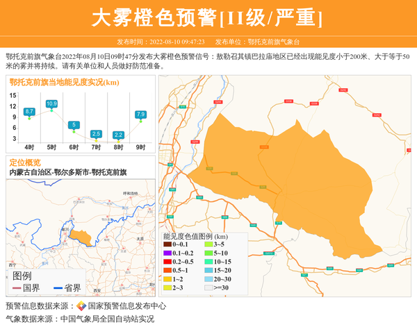 鄂托克前旗气象台2022年08月10日09时47分发布大雾橙色预警信号:敖勒召其镇巴拉庙地区已经出现能见度小于200米、大于等于50米的雾并将持续。请有关单位和人员做好防范准备。 信息来源:国家预警信息发布中心; 发布单位:鄂托克前旗气象台。