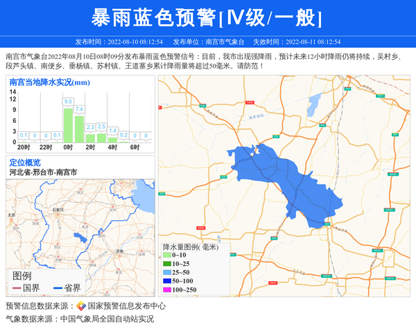 南宫市气象台2022年08月10日08时09分发布暴雨蓝色预警信号:目前,我市出现强降雨,预计未来12小时降雨仍将持续,吴村乡、段芦头镇、南便乡、垂杨镇、苏村镇、王道寨乡累计降雨量将超过50毫米。请防范! 信息来源:国家预警信息发布中心; 发布单位:南宫市气象台。