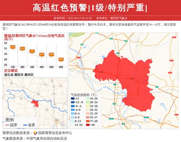 襄州区气象台2022年08月12日06时29分发布高温红色预警信号:预计今天白天,襄州大部乡镇最高气温将升至39~42℃,请注意防范! 信息来源:国家预警信息发布中心; 发布单位:襄州区气象台。
