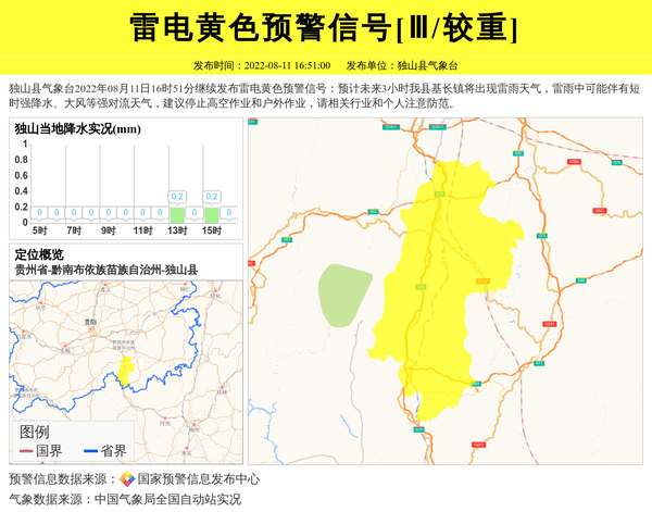 独山县气象台2022年08月11日16时51分继续发布雷电黄色预警信号:预计未来3小时我县基长镇将出现雷雨天气,雷雨中可能伴有短时强降水、大风等强对流天气,建议停止高空作业和户外作业,请相关行业和个人注意防范。 信息来源:国家预警信息发布中心; 发布单位:独山县气象台。