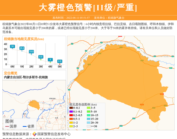 杭锦旗气象台2022年08月11日05时51分发布大雾橙色预警信号:6小时内独贵塔拉镇、巴拉贡镇、吉日嘎朗图镇、呼和木独镇、伊和乌素苏木可能出现能见度小于200米的雾,或者已经出现能见度小于200米、大于等于50米的雾并将持续。请有关单位和人员做好防范准备。 信息来源:国家预警信息发布中心; 发布单位:杭锦旗气象台。