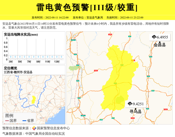 安远县气象台2022年08月11日14时22分发布雷电黄色预警信号:预计未来6小时内,我县所有乡镇有雷电活动,局地伴有短时强降水、雷暴大风等强对流天气,请注意防范。 信息来源:国家预警信息发布中心; 发布单位:安远县气象局。