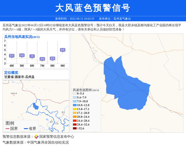 瓜州县气象台2022年08月12日10时02分继续发布大风蓝色预警信号:预计今天白天,我县大部乡镇及柳沟煤化工产业园仍将出现平均风力5~6级,阵风7~8级的大风天气,并伴有沙尘,请有关单位和人员做好防范准备! 信息来源:国家预警信息发布中心; 发布单位:瓜州县气象台。