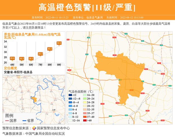 临泉县气象台2022年08月11日10时13分变更发布高温橙色预警信号。24小时内临泉县的宋集、庞营、白庙等大部分乡镇最高气温将升至37℃以上,请注意防暑降温! 信息来源:国家预警信息发布中心; 发布单位:临泉县气象局。