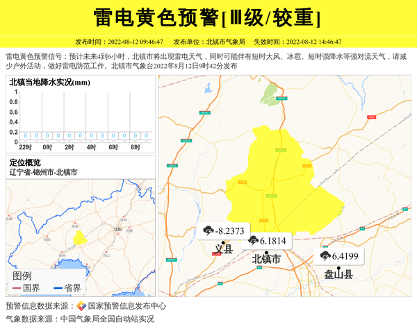 雷电黄色预警信号:预计未来4到6小时,北镇市将出现雷电天气,同时可能伴有短时大风、冰雹、短时强降水等强对流天气,请减少户外活动,做好雷电防范工作。北镇市气象台2022年8月12日9时42分发布 信息来源:国家预警信息发布中心; 发布单位:北镇市气象局。