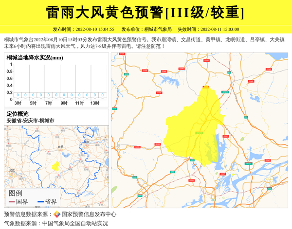 桐城市气象台2022年08月10日15时03分发布雷雨大风黄色预警信号。我市唐湾镇、文昌街道、黄甲镇、龙眠街道、吕亭镇、大关镇未来6小时内将出现雷雨大风天气,风力达7-8级并伴有雷电。请注意防范! 信息来源:国家预警信息发布中心; 发布单位:桐城市气象局。