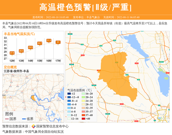丰县气象台2022年08月10日18时04分升级发布高温橙色预警信号:预计今天我县所有镇(街道)最高气温将升至37℃以上,县应急局、气象局联合提醒加强防范。 信息来源:国家预警信息发布中心; 发布单位:丰县气象台。