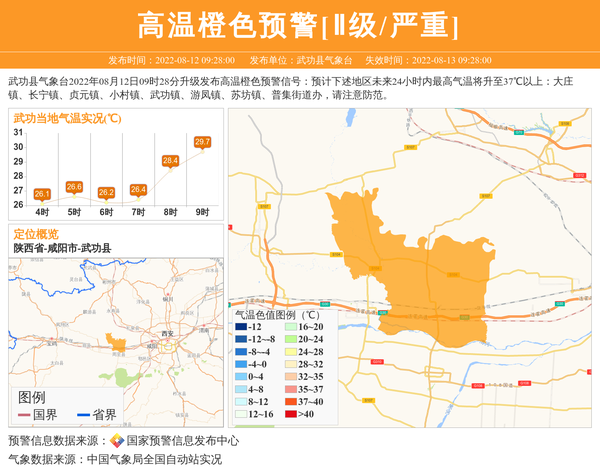 武功县气象台2022年08月12日09时28分升级发布高温橙色预警信号:预计下述地区未来24小时内最高气温将升至37℃以上:大庄镇、长宁镇、贞元镇、小村镇、武功镇、游凤镇、苏坊镇、普集街道办,请注意防范。 信息来源:国家预警信息发布中心; 发布单位:武功县气象台。