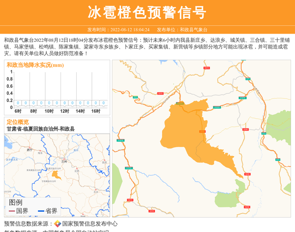和政县气象台2022年08月12日18时04分发布冰雹橙色预警信号:预计未来6小时内我县新庄乡、达浪乡、城关镇、三合镇、三十里铺镇、马家堡镇、松鸣镇、陈家集镇、梁家寺东乡族乡、卜家庄乡、买家集镇、新营镇等乡镇部分地方可能出现冰雹,并可能造成雹灾。请有关单位和人员做好防范准备! 信息来源:国家预警信息发布中心; 发布单位:和政县气象台。