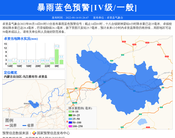 卓资县气象台2022年08月14日01时13分发布暴雨蓝色预警信号:截止14日01时,十八台镇财神梁站6小时降水量已达35毫米、卓镇校准站降水量已达28.4毫米,巴音锡勒镇26.1毫米,旗下营那只亥站25.7毫米,预计未来12小时内卓资县降雨仍将持续,局部地区可达50毫米或以上。请有关单位和人员做好防范准备。 信息来源:国家预警信息发布中心; 发布单位:卓资县气象台。