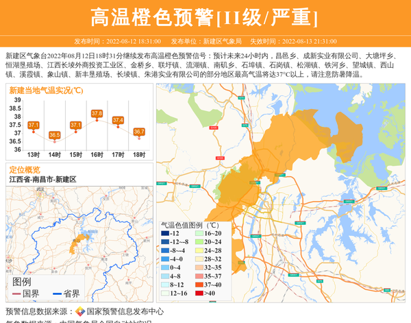 新建区气象台2022年08月12日18时31分继续发布高温橙色预警信号:预计未来24小时内,昌邑乡、成新实业有限公司、大塘坪乡、恒湖垦殖场、江西长堎外商投资工业区、金桥乡、联圩镇、流湖镇、南矶乡、石埠镇、石岗镇、松湖镇、铁河乡、望城镇、西山镇、溪霞镇、象山镇、新丰垦殖场、长堎镇、朱港实业有限公司的部分地区最高气温将达37°C以上,请注意防暑降温。 信息来源:国家预警信息发布中心; 发布单位:新建区气象局。