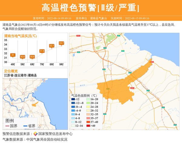 灌南县气象台2022年08月14日09时47分继续发布高温橙色预警信号:预计今天白天我县各镇最高气温将升至37℃以上,县应急局、气象局联合提醒做好防范。 信息来源:国家预警信息发布中心; 发布单位:灌南县气象台。