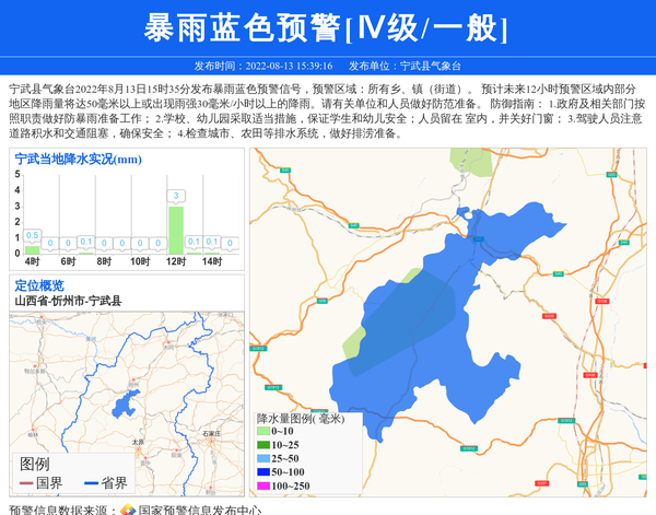 宁武县气象台2022年8月13日15时35分发布暴雨蓝色预警信号,预警区域:所有乡、镇(街道)。 预计未来12小时预警区域内部分地区降雨量将达50毫米以上或出现雨强30毫米/小时以上的降雨。请有关单位和人员做好防范准备。 防御指南: 1.政府及相关部门按照职责做好防暴雨准备工作; 2.学校、幼儿园采取适当措施,保证学生和幼儿安全;人员留在 室内,并关好门窗; 3.驾驶人员注意道路积水和交通阻塞,确保安全; 4.检查城市、农田等排水系统,做好排涝准备。 信息来源:国家预警信息发布中心; 发布单位:宁武县气象台。