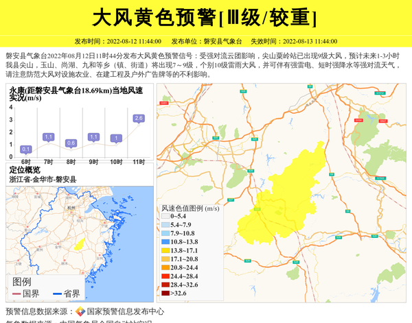 磐安县气象台2022年08月12日11时44分发布大风黄色预警信号:受强对流云团影响,尖山粟岭站已出现9级大风,预计未来1-3小时我县尖山,玉山、尚湖、九和等乡(镇、街道)将出现7~9级,个别10级雷雨大风,并可伴有强雷电、短时强降水等强对流天气,请注意防范大风对设施农业、在建工程及户外广告牌等的不利影响。 信息来源:国家预警信息发布中心; 发布单位:磐安县气象台。