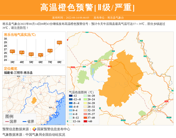将乐县气象台2022年08月14日08时43分继续发布高温橙色预警信号:预计今天午后我县最高气温可达37~39℃,部分乡镇超过39℃,请注意防范! 信息来源:国家预警信息发布中心; 发布单位:将乐县气象台。