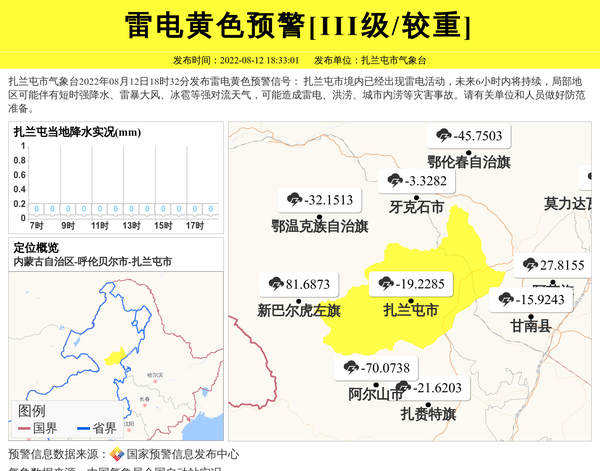 扎兰屯市气象台2022年08月12日18时32分发布雷电黄色预警信号: 扎兰屯市境内已经出现雷电活动,未来6小时内将持续,局部地区可能伴有短时强降水、雷暴大风、冰雹等强对流天气,可能造成雷电、洪涝、城市内涝等灾害事故。请有关单位和人员做好防范准备。 信息来源:国家预警信息发布中心; 发布单位:扎兰屯市气象台。