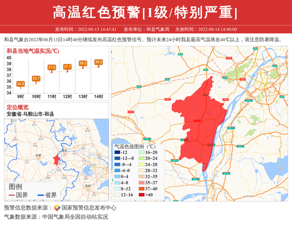 和县气象台2022年08月13日14时40分继续发布高温红色预警信号。预计未来24小时我县最高气温将在40℃以上,请注意防暑降温。 信息来源:国家预警信息发布中心; 发布单位:和县气象局。