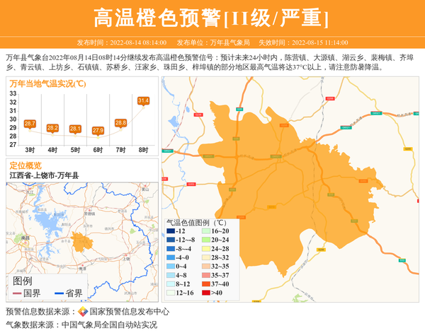 万年县气象台2022年08月14日08时14分继续发布高温橙色预警信号:预计未来24小时内,陈营镇、大源镇、湖云乡、裴梅镇、齐埠乡、青云镇、上坊乡、石镇镇、苏桥乡、汪家乡、珠田乡、梓埠镇的部分地区最高气温将达37°C以上,请注意防暑降温。 信息来源:国家预警信息发布中心; 发布单位:万年县气象局。