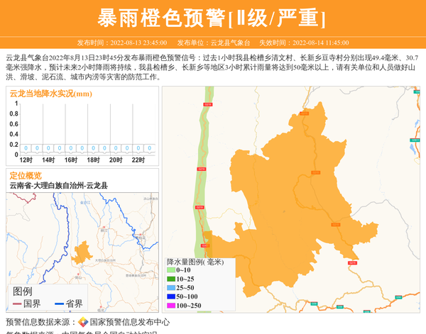 云龙县气象台2022年8月13日23时45分发布暴雨橙色预警信号:过去1小时我县检槽乡清文村、长新乡豆寺村分别出现49.4毫米、30.7毫米强降水,预计未来2小时降雨将持续,我县检槽乡、长新乡等地区3小时累计雨量将达到50毫米以上,请有关单位和人员做好山洪、滑坡、泥石流、城市内涝等灾害的防范工作。 信息来源:国家预警信息发布中心; 发布单位:云龙县气象台。
