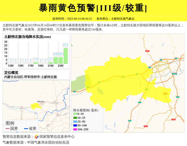 土默特左旗气象台2022年08月14日00时37分发布暴雨黄色预警信号:预计未来6小时,土默特左旗大部地区降雨量将达50毫米以上;其中圪力更村、哈素海、吴朋圪堆村、只几梁一带降雨量将超过100毫米。 信息来源:国家预警信息发布中心; 发布单位:土默特左旗气象台。