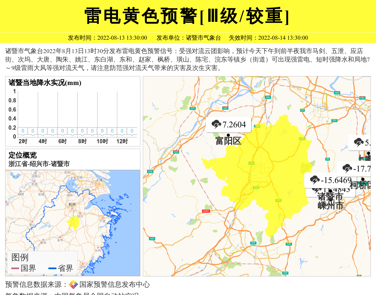 诸暨市气象台2022年8月13日13时30分发布雷电黄色预警信号:受强对流云团影响,预计今天下午到前半夜我市马剑、五泄、应店街、次坞、大唐、陶朱、姚江、东白湖、东和、赵家、枫桥、璜山、陈宅、浣东等镇乡(街道)可出现强雷电、短时强降水和局地7~9级雷雨大风等强对流天气,请注意防范强对流天气带来的灾害及次生灾害。 信息来源:国家预警信息发布中心; 发布单位:诸暨市气象台。