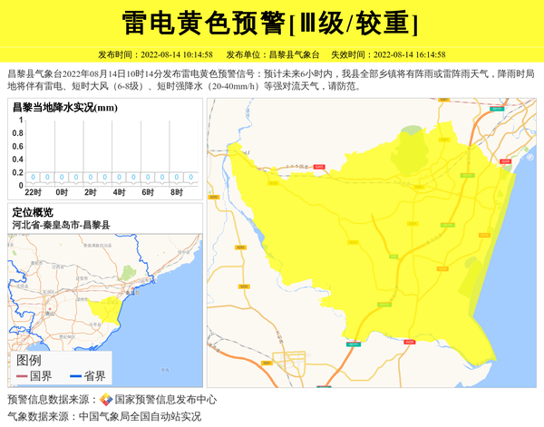 昌黎县气象台2022年08月14日10时14分发布雷电黄色预警信号:预计未来6小时内,我县全部乡镇将有阵雨或雷阵雨天气,降雨时局地将伴有雷电、短时大风(6-8级)、短时强降水(20-40mm/h)等强对流天气,请防范。 信息来源:国家预警信息发布中心; 发布单位:昌黎县气象台。