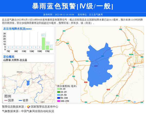 左云县气象台2022年8月13日18时08分发布暴雨蓝色预警信号:截止目前我县左云国家站降水量已达34.3毫米,预计未来12小时内降雨仍将持续,部分乡镇降雨量将达到或超过50毫米,预警区域:所有乡、镇(街道)。 信息来源:国家预警信息发布中心; 发布单位:左云县气象局。