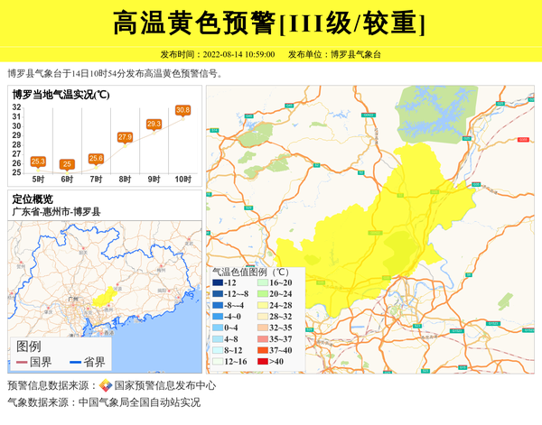 博罗县气象台于14日10时54分发布高温黄色预警信号。 信息来源:国家预警信息发布中心; 发布单位:博罗县气象台。